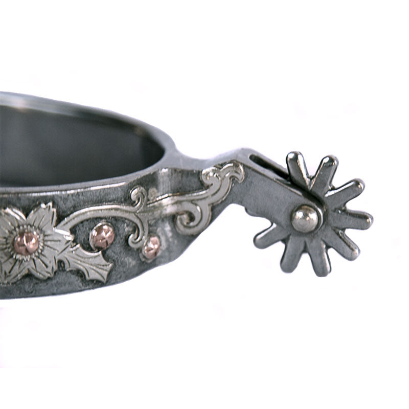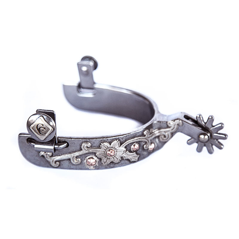 The Chris Cox Signature spur is exclusively designed by Chris and is an essential tool when used properly to enhance, aid in communication, for subtle cues and advancing horsemanship techniques. Chris has used and studied spurs for thirty years and is specific about the details of creating a spur that is functional, durable, yet has great eye appeal. The short shank spur features a floral design is weighted stainless steel for a solid feel and to encourage it to properly ride on the boots spur ridge. The band length is 8" with a smooth contoured edge, a 1 1/2" shank with a rounded 10 point rowel. **This spur when exposed to the elements is designed rust over time for an antique finish.**