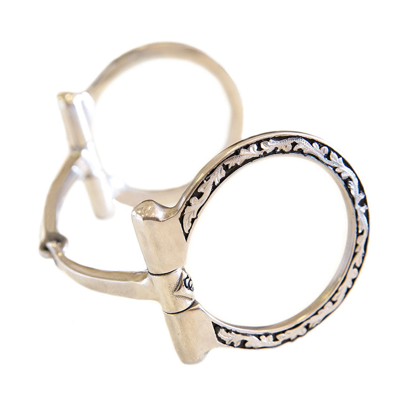 Personally Designed by Chris this Swivel Snaffle has a Square mouthpiece. This bit is a great transition from the smooth snaffle. It offers the rider more sensitivity and feel and is great for refining softness and working on lifting the shoulders and ribcage. The D Rings are weighted and made of stainless steel and engraved with a floral design including the CC logo. The mouthpiece is 5 1/4"and made of sweet iron. Note: This bit will rust when exposed to moisture and creates a sweet taste in the horse's mouth and promotes salivation.